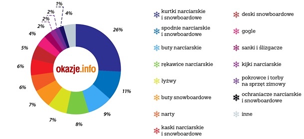 Z przeprowadzonej analizy wynika, że wśród Internautów odwiedzających kategorię "Sporty zimowe", aż 26% poszukuje kurtek narciarskich i snowboardowych. Pozostałe grupy produktowe, wchodzące w skład danej kategorii cieszą się wyraźnie mniejszym zainteresowaniem, utrzymującym się w większości przypadków na zbliżonym do siebie poziomie, oscylującym w granicach od 4 do 9%. W tym miejscu warto jednak zauważyć, że Polacy częściej niż zimowego sprzętu sportowego, poszukują w sieci odzieży na stok. Narty z wynikiem 7%, znalazły się dopiero na 7 miejscu w rankingu popularności poszczególnych grup, a deski snowboardowe, generując 6% wszystkich odsłon kategorii - na miejscu 9. Otrzymane statystyki pozwalają przypuszczać, że polscy entuzjaści sportów zimowych doskonale zdają sobie sprawę z tego, że do komfortowego i bezpiecznego uprawienia tych właśnie dyscyplin niezbędny jest sprzęt precyzyjnie dostosowany do potrzeb i umiejętności użytkownika. Choć w pierwszej kolejności szukamy wygodnych strojów, gwarantujących utrzymanie właściwej temperatury naszego ciała, coraz częściej zależy nam również na tym, by na stoku prezentować się po prostu modnie.