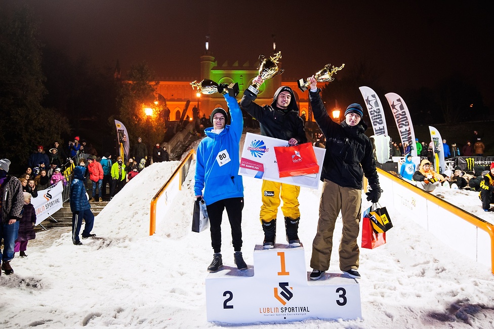 Opórcz stylowych tricków na railach, mieliśmy również okazję podziwiać wysokie loty na poduszkę, w których wygrał Dawid Rząca, tym samym zgarniając z pozostałą dwójką (Dawidem Balasem oraz Piotrem Tomczykowskim) puchary od Miasta Lublin oraz mi.in wyjazd sponsorowany przez SnowSnow, kurs Kitesurfingu od Kiteszkoła oraz mnóstwo nagród rzeczowych.